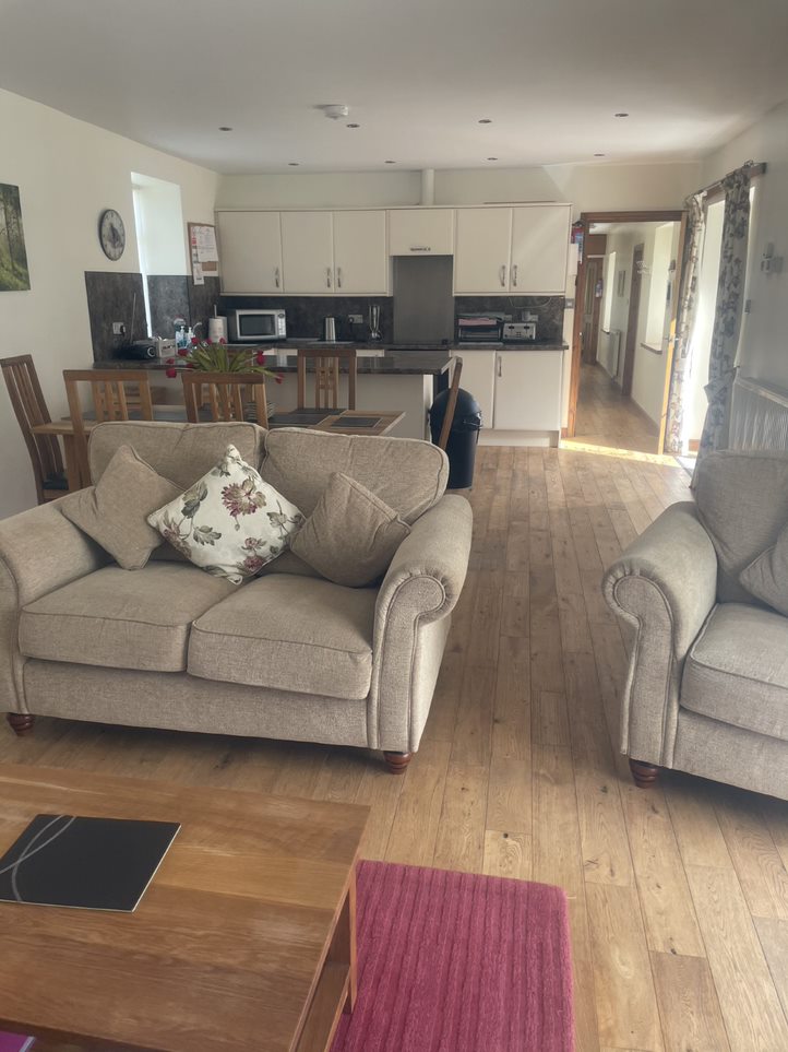 - Open plan living area with kitchen, dining area and sitting area with wood burner.