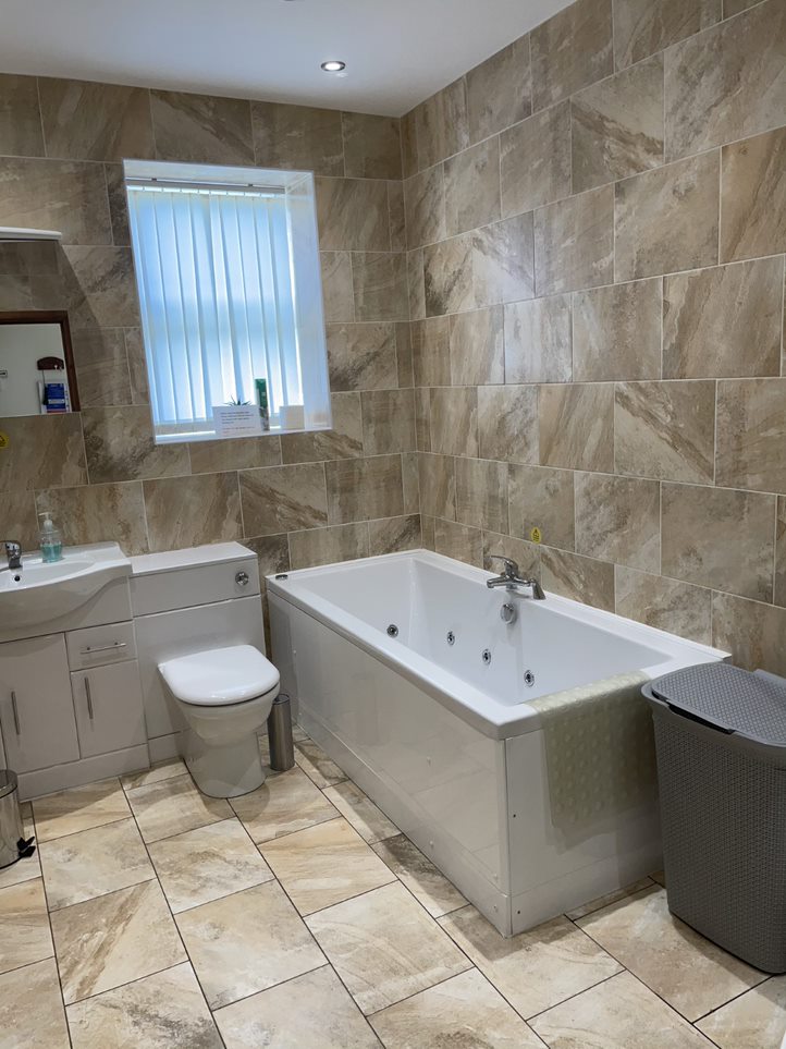 - Bathroom with whirlpool bath, separate shower, basin, and WC
